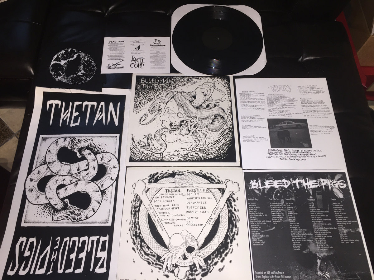 This junt comes with a poster, a patch, a couple of inserts, and a record that has been etched not once, but twice. Almost everything in this release is screen printed on stuff we could have just as easily thrown away.